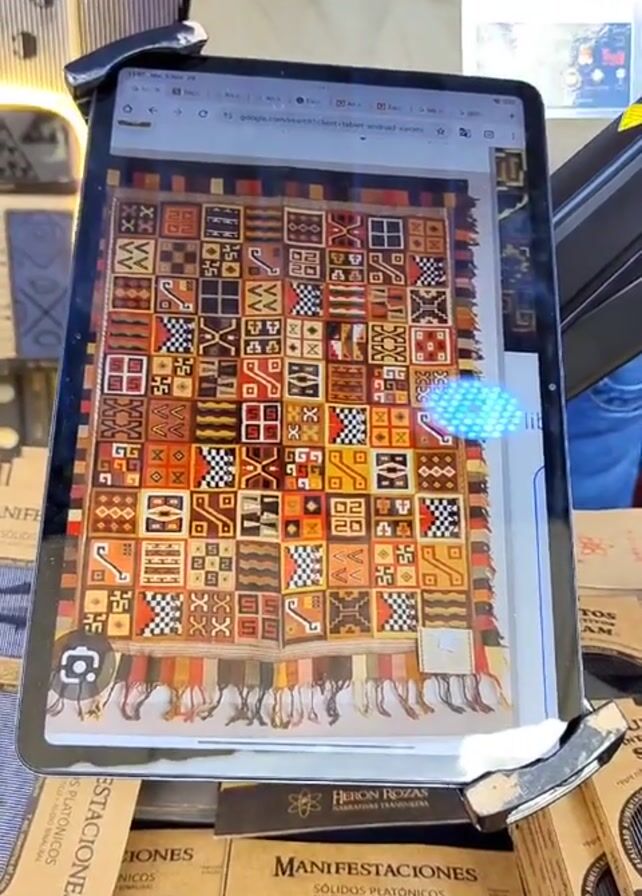 A person holds a tablet with a photo on screen of a woven textile featuring complex geometric patterns in brown, red, black, and beige. The tablet is positioned above a table with boxes of what appear to be Platonic solids in packaging, and a poster that says "PARTICIPANTE" in the background. The person is likely displaying or discussing the textile, possibly as an example of traditional artwork or a cultural artifact. The scene seems to be an exposition.