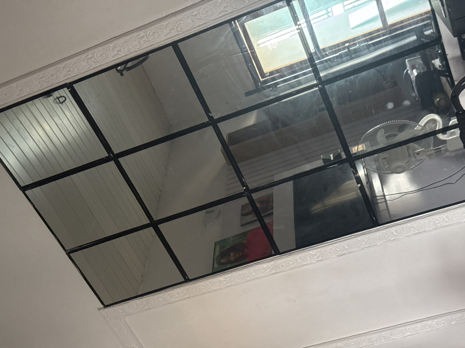 The image depicts an interior scene within a room in Ado, Nigeria, captured at an oblique angle. The primary subject is a large, rectangular wall-mounted mirror, segmented into twelve smaller rectangular panels by a black grid frame. The mirror's left edge is bordered by decorative white molding. Reflected in the mirror are various elements of the room: - A white, corrugated ceiling is visible in the upper sections. - White walls are present, with ornate, scrolled molding reflected on the immediate left side. - Two framed pictures rest on a horizontal surface, possibly a shelf or dresser. The left picture displays a person, likely a female, wearing a red garment. The second picture to its right shows another individual, partially visible. - Below these pictures, a large, dark, rectangular object, possibly a television or furniture piece, is reflected. - A white standing fan with a circular grate and base is reflected in the lower right portion of the mirror, with visible power cords. - A window, through which ambient daylight enters, is reflected in the rightmost panels, revealing its dark frame. The overall environment suggests a furnished indoor space. No individuals are directly visible, only their reflections in the framed pictures.