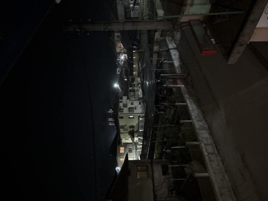 This image presents a nighttime elevated view of a residential neighborhood in Cherven Bryag, Bulgaria. The scene is dominated by darkness, illuminated by artificial light sources. In the immediate foreground on the right, the concrete edge of a building's roof or balcony is partially visible, with a rectangular red object, possibly a sign or container, mounted below it. A substantial utility pole with numerous wires extends vertically from the mid-ground to the top right of the frame. A dark, unlit paved street runs horizontally across the mid-ground. To the left of the street, a low concrete wall topped with fence posts and wire fencing encloses a series of dark, vegetated garden plots. Within this enclosed area, a translucent, wet-looking canopy structure shelters multiple dark-colored vehicles, including at least two automobiles. Beyond the garden plots and the street, several multi-story residential buildings are visible. These houses typically feature light-colored facades, dark tiled roofs, and balconies. Multiple windows in these structures are illuminated with warm, yellow light. Faint plumes of smoke are discernible rising from chimneys on at least two houses, suggesting heating activity. In the background, distant streetlights emit bright white light, contributing to the overall illumination of the distant parts of the neighborhood. Overhead electrical wires traverse the dark night sky. No individuals or discernible actions are visible in the static scene.