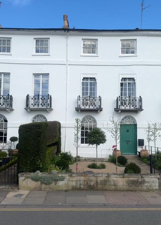 street view of a row of terraced houses on a sunny day. The camera pans from right to left, showcasing the architectural style of the houses. The first building is painted white with a green front door and wrought iron balconies. The rest of the houses in the terrace are painted in a similar style, and have gardens with hedges and trees in front of them. The street in front of the houses has double yellow lines and several cars parked along it. The sky is blue with some white clouds.