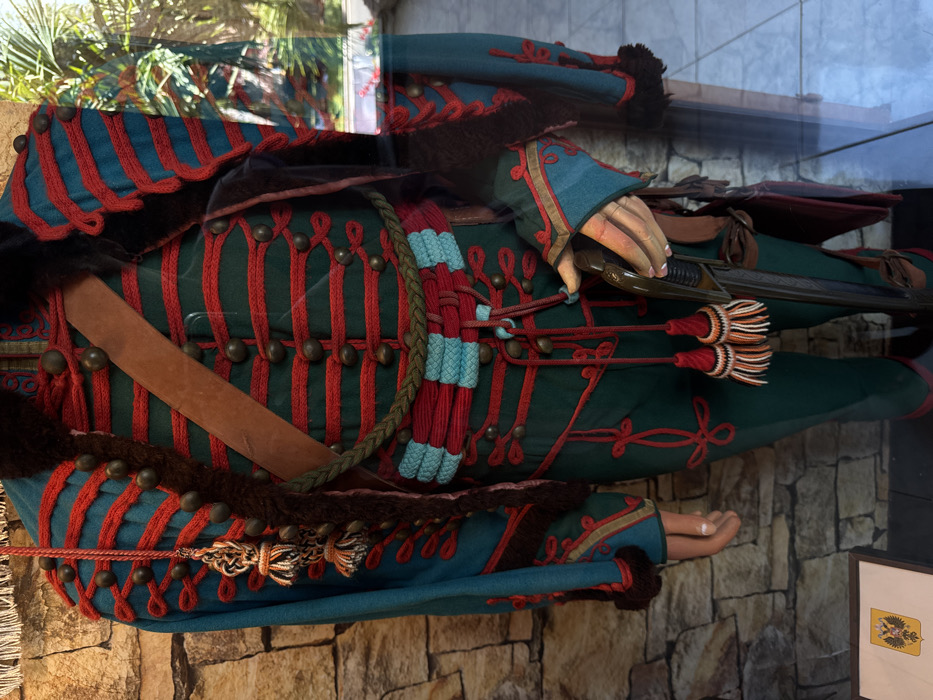 A mannequin in a green and teal military uniform is displayed behind glass. The uniform is elaborately decorated with red vertical stripes, brown buttons, and fur trim around the shoulders. It features a brown leather strap and a woven rope detail. The mannequin's hand holds a sheathed sword. The scene is set against a stone-textured background.