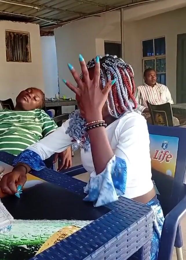 A woman sits at a table with a plastic Life beer advertisement on the chair back. She has long blue manicured nails and is covering her face with her hand. She has multicolored braided hair, and is wearing a white top with blue flared sleeves, and a blue and white skirt. Behind her to her left, another person is slumped asleep in a chair. To her right, another man sits at a table. The location appears to be a covered outdoor area or a porch with tables and chairs.