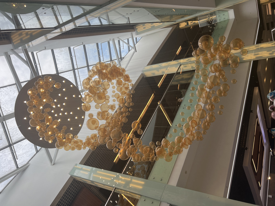 This image displays the interior atrium of Dana Mall, located at P. Mstislavtsa St 11, Minsk, Belarus. The central and dominant subject is a large, multi-story chandelier constructed from numerous amber-toned, spherical glass elements of various sizes. These elements are suspended from a large, dark, circular ceiling plate that also features multiple integrated downlights. The spheres form a cascading, curvilinear design, appearing internally illuminated. The architectural environment consists of a modern, multi-level structure with a prominent glass skylight overhead, revealing an overcast sky. Upper levels are visible with transparent glass railings and dark, grid-patterned mesh backings. Vertical columns with linear light features are present. One individual is partially visible on an upper level, positioned behind a glass railing, observing the scene. The lower portion of the image shows blurred elements consistent with a mall environment.