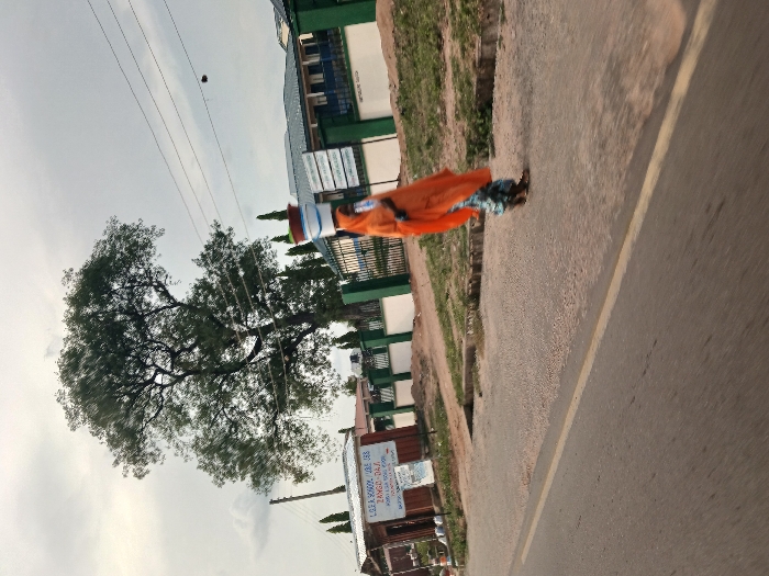 The scene depicts an outdoor environment in Lokoja, Nigeria, specifically adjacent to the L.G.E.A. School, Zango-Daji. A female individual, clad in a flowing orange garment over patterned lower clothing, walks from right to left on the unpaved shoulder alongside a paved asphalt road. She carries a white bucket balanced on her head. The road, visible in the foreground, features a single solid yellow line. To the left, a small, rustic structure with a corrugated metal roof displays a legible sign indicating "L.G.E.A. SCHOOL, ZANGO-DAJI." Behind a green and white fence, modern-style school buildings with light blue roofs and white walls are partially visible. A large, mature tree with a dense canopy dominates the mid-ground, while several smaller, conical evergreen trees are aligned along the fence. Utility lines traverse the upper portion of the frame against an overcast sky.