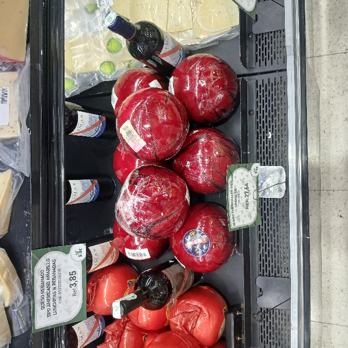 The image presents a refrigerated display case in a commercial establishment, likely a supermarket, situated in Santa Ana, Venezuela. The central focus is on a grouping of approximately nine spherical cheeses, each encased in a reddish-orange wax coating and individually wrapped in clear plastic film. Several of these red cheeses have white rectangular labels affixed, indicating product data, and one displays a distinctive circular blue and gold sticker. Interspersed among these spherical cheeses are at least four dark glass bottles of red wine, each featuring a label with the brand "LIMAS" and a landscape illustration. In the background and to the right, various vacuum-sealed packages of yellow and white cheeses are visible, some appearing to be pre-sliced. Two green price tags are prominent: one in the top-left quadrant advertises "QUESO REBANADO TIPO AMERICANO AMARILLO LUNCHITAS 16 REBANADAS" (Sliced American Yellow Cheese, 16 Slices) for "REF. 3,85". Another tag, located in the bottom-center, specifies "QUESO EMMENTHALER EN BARRA GRAND'OR" (Emmenthaler Cheese in Bar Grand'Or) priced at "REF. 27,64". The products are displayed on a black grated surface within the case, with a dark metal rail visible at the bottom edge. The floor in front of the display is composed of light-colored square tiles. No individuals or active interactions are depicted in the scene.