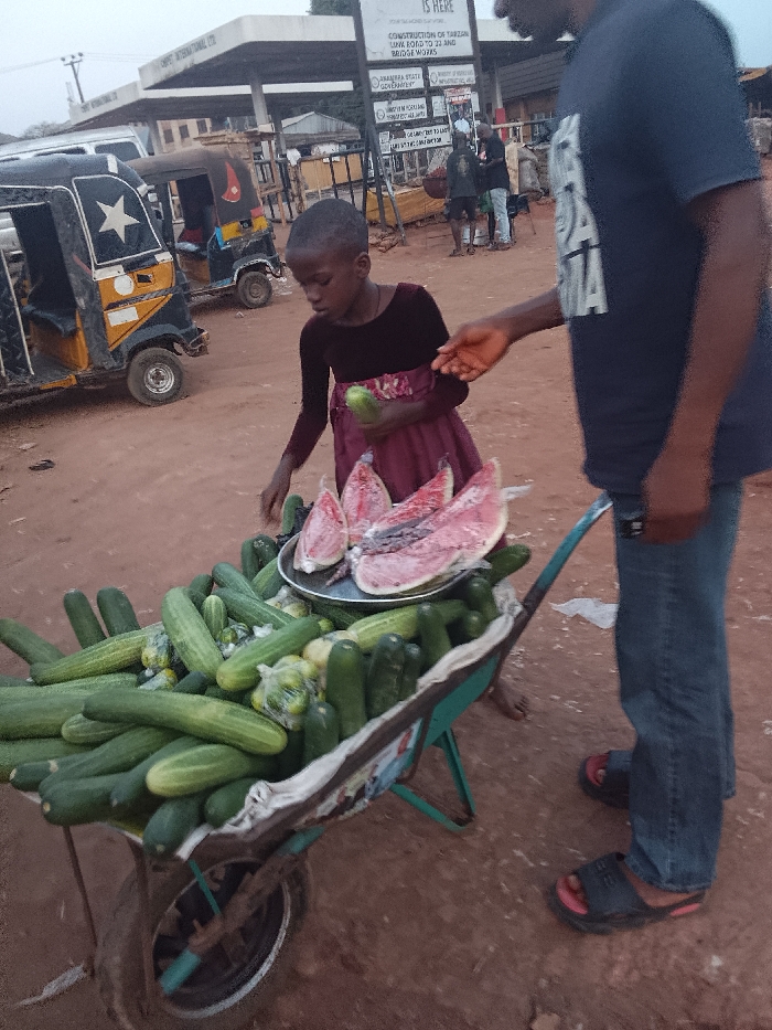 A young girl in a maroon dress stands next to a wheelbarrow filled with cucumbers and watermelon slices. She holds a cucumber. A man in jeans and a dark t-shirt stands next to her, appearing to examine the produce. The scene unfolds in what looks like a street or marketplace, with auto rickshaws and people in the background, alongside a sign detailing road construction. The overall setting suggests a market scene in an African nation.