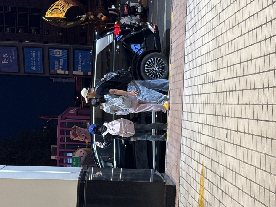 A nighttime urban scene is depicted on Wangfujing Street S in Dongcheng District, Beijing, China. Three individuals are positioned on a light-colored tiled sidewalk. The leftmost person, wearing a blue baseball cap, dark top, and light pink backpack, holds a smartphone to photograph or video a subject out of frame to the right. Their reflection is visible in the adjacent black SUV/minivan's window. Beside them, a second individual, wearing a light-colored top, light pink pants, yellow sneakers, and a small white backpack, stands looking in the same direction. The third person, on the right, wears a light-colored baseball cap, black t-shirt, black backpack, and light blue wide-legged jeans, also observing the scene. A black SUV or minivan is parked parallel to the sidewalk, immediately behind the three individuals, featuring multi-spoke alloy wheels and illuminated red taillights. In the background, a pink building structure displays two large animated food mascots (a burrito and a wrap). To the right, a vertical stack of illuminated commercial billboards advertises "Peets," "GAIA SPA," and "FamilyMart" among other Chinese text. A large, abstract, golden sculpture is visible behind the vehicle on the right. The dark night sky and artificial lighting characterize the environment. A white delivery scooter with a red box is parked further down the street on the right.