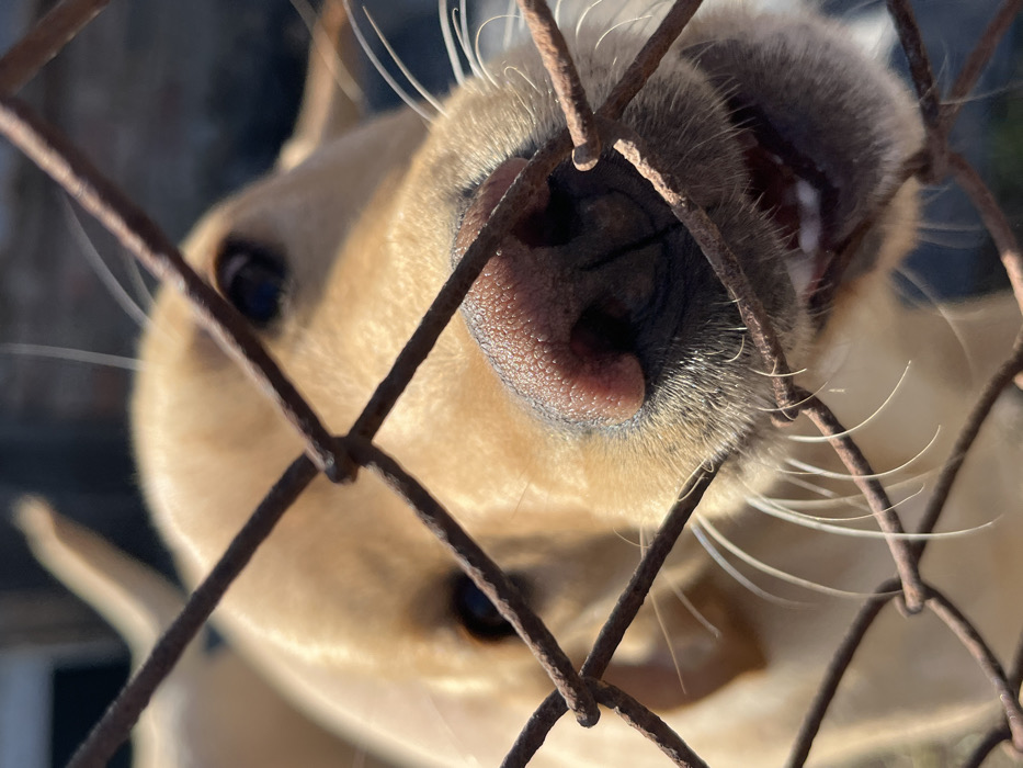 - "A close-up image taken in Bulgarovo, Bulgaria, captures the head of a light brown or tan dog peering through a rusty, coarse-mesh wire fence" by FM-ufW5l2, licensed under CC BY 4.0
