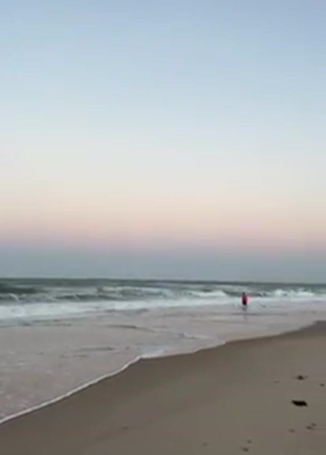 The video depicts a beach scene at dawn or dusk, with a person in red walking along the shoreline