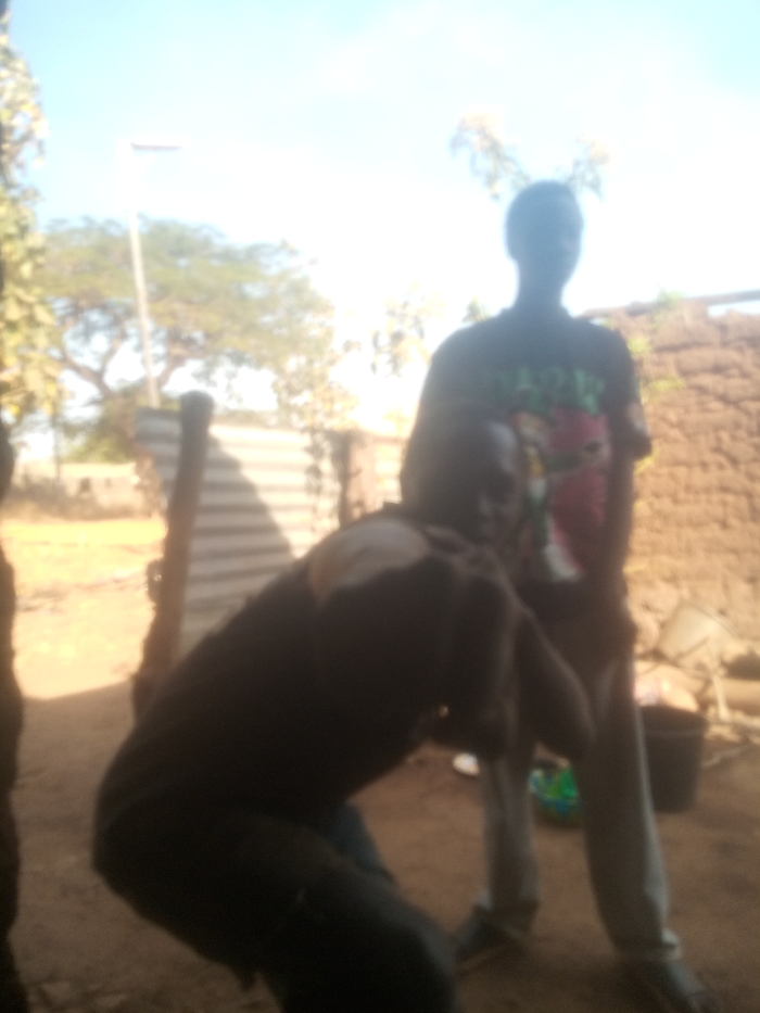 The image is significantly out of focus and partially overexposed in the upper portion. It depicts an outdoor scene in Agban, Nigeria, featuring two individuals. In the foreground, one person is bent over, facing away from the camera, dressed in dark attire with a lighter patch on the upper back/shoulder. Behind this individual, a second person stands upright, mostly silhouetted against the bright sky. This standing individual wears a dark t-shirt with a multi-colored graphic design on the front and light-colored trousers. The ground beneath them is dirt. In the mid-ground, a corrugated metal structure is visible, and to the right, a wall constructed from an earthy material. A black bucket and several indistinct objects rest on the ground near the standing person. The background includes sparse vegetation and a pole-like structure under a bright, clear sky.