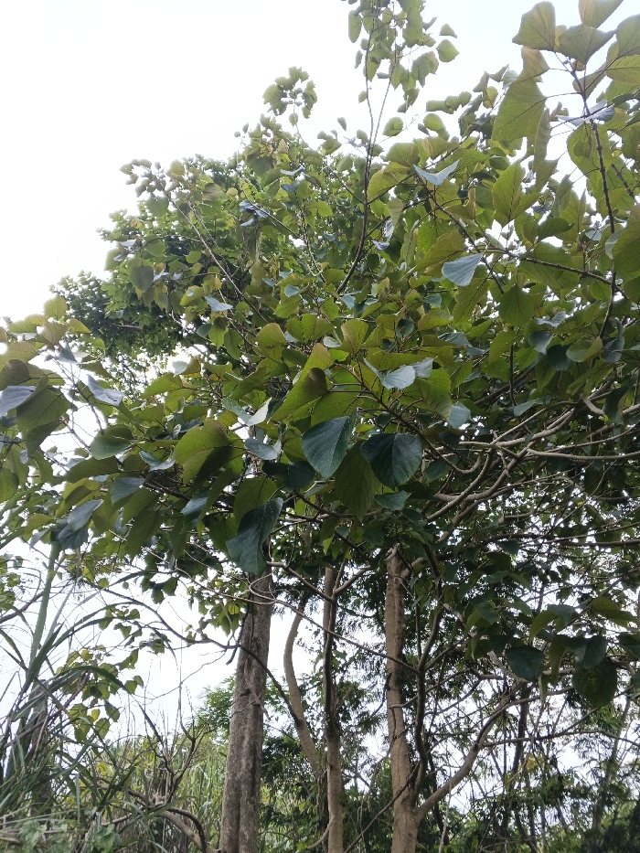 The image displays an upward view into a dense canopy of deciduous trees within an outdoor natural environment in Chengdu, China. The primary subject is a tree with large, broadly ovate to heart-shaped green leaves, which are predominantly medium to dark green with some lighter tones. Numerous branches extend from several visible tree trunks in the lower and mid-sections of the frame. The trunks are varied in texture, with some appearing smooth and greyish-brown. Bare thinner branches are visible amongst the foliage. An overcast or brightly illuminated pale sky is present in the upper left and center-right portions of the frame, visible through gaps in the leaves. Denser, darker green vegetation is visible in the lower background. No human figures, animals, structures, or discernible human activity are present.
