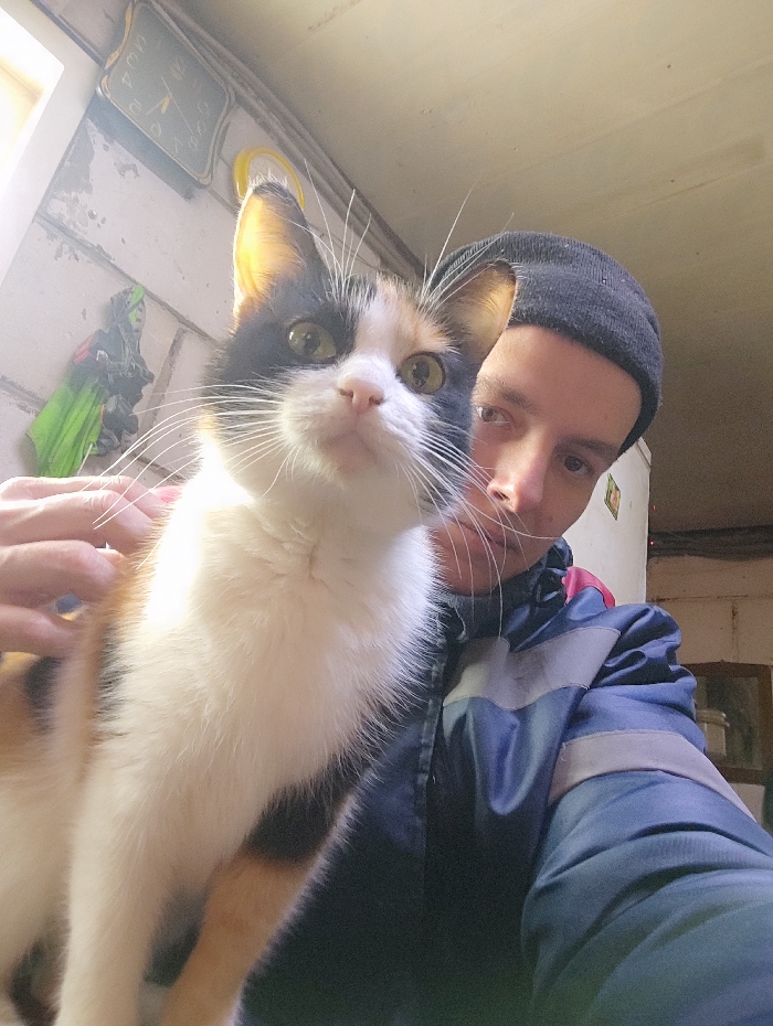 - "An indoor, low-angle selfie captures a person holding a calico cat" by FM-1C5Nu2, licensed under CC BY 4.0