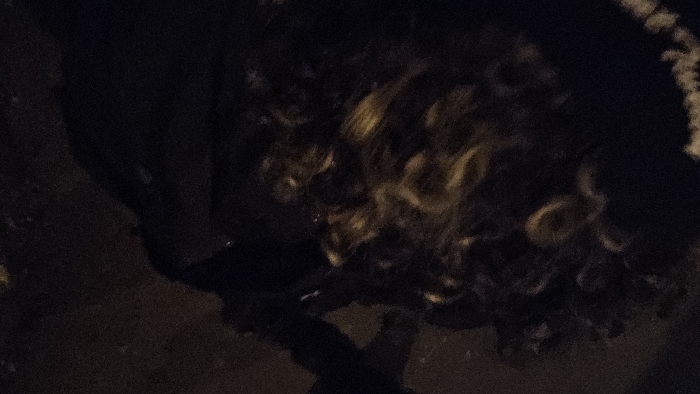 A close-up shot in low lighting reveals a person with dark, curly hair. Parts of the hair appear to have some blonde highlights. The person is wearing dark clothing, which blends into the dark background, making it difficult to discern details. The focus is primarily on the texture and style of the hair.