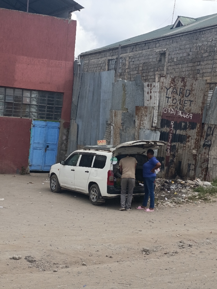 This image depicts an outdoor scene in Matungulu west ward, Kenya, under an overcast sky. A white, five-door station wagon, identified as a taxi by a roof sign, is parked on unpaved ground with its rear hatch open. Two individuals are standing at the rear of the vehicle. A male in a light brown t-shirt and grey trousers is positioned facing into the open trunk, engaged with its contents. A female in a blue t-shirt, blue jeans, and pink slip-on sandals stands beside him, observing the trunk. To the left of the vehicle, a red-painted building features multiple grid-patterned windows and a closed blue double door. Faint white text reading "SERVICES OFFERED" is visible on its upper wall. To the right of the vehicle, an unpaved area contains a pile of discarded rubbish. This area is bordered by an irregular wall constructed from various corrugated metal sheets, some severely rusted. Written in black paint on one of these sheets is "YARD TO LET" followed by the phone number "0724 314469." Behind the corrugated metal barrier, a two-story building constructed from grey concrete blocks with a green sloped roof is visible, featuring several window openings, some of which are barred. The ground throughout the visible area is dirt and gravel.