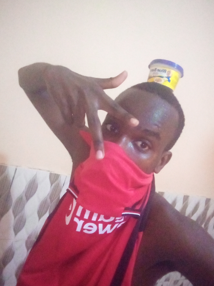 An image depicts a male individual, appearing to be a young adult with dark skin and short, dark hair, captured in an upward-angled close-up. The individual's eyes are visible and directed towards the viewer, while the nose and mouth are obscured by a piece of red fabric, likely the individual's red sleeveless top or jersey, which features inverted white text. The right hand is raised, displaying a gesture where the thumb, index finger, and pinky finger are extended, and the middle and ring fingers are bent. A small, yellow plastic container with a blue lid, identifiable by the mirrored text "Blue Band," is balanced on the top of the individual's head. The background is a plain, light-colored wall, with a patterned surface featuring wavy, leaf-like designs in shades of brown and grey visible on the lower right side. The scene is located in Mtopanga ward, Kenya.