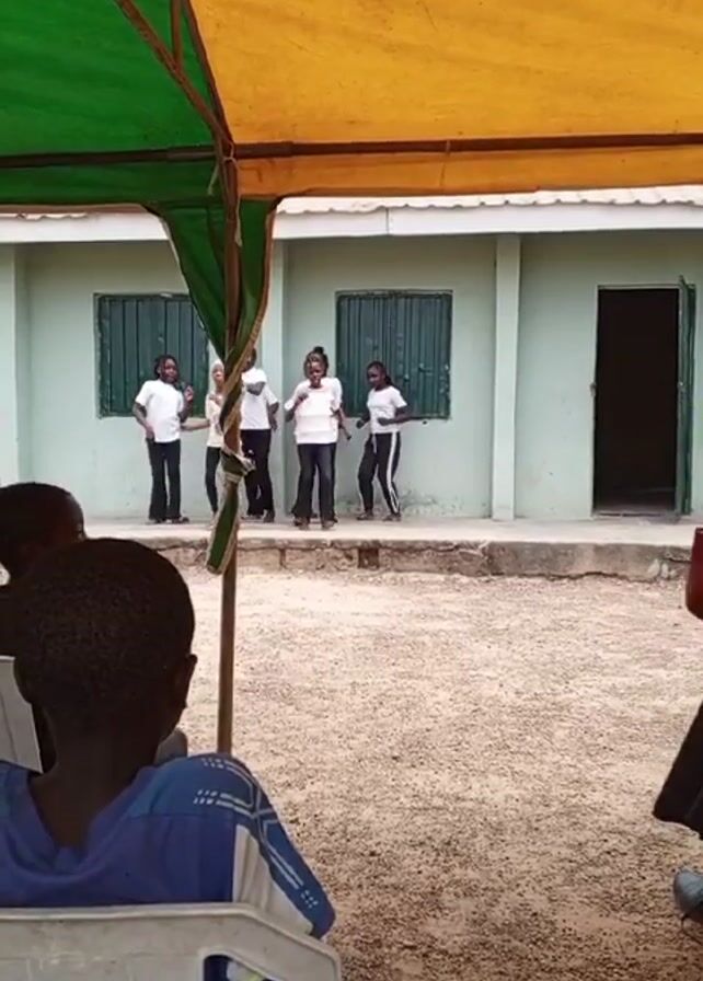 five children, dressed in white shirts and dark pants, standing on a concrete platform in front of a light-green building. They appear to be singing or performing. A few children sit in chairs facing them, watching the performance. A green and yellow tent provides shade over the audience. The ground is covered in gravel. A woman with a red bag is seen briefly on the right side of the frame.