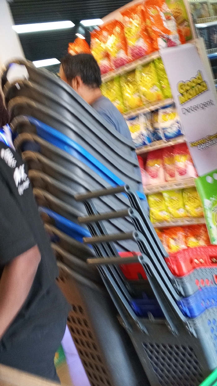 This image depicts an indoor retail environment in Tarauni, Nigeria. In the foreground, a prominent stack of approximately ten dark gray plastic shopping baskets is visible, featuring blue and red accents on their handles and perforated sides. To the immediate left, a person's left arm and a portion of their torso, clad in a dark t-shirt with a light-colored logo or text, are partially visible. Further in the mid-ground, the back of a second individual is seen, wearing a light blue or gray t-shirt, with short, dark hair. The background consists of brightly lit retail shelves displaying numerous packaged products in colorful bags, including orange, yellow, pink, and blue. A white vertical sign on one of the shelves prominently displays "Good Mama Detergent." Overhead, linear fluorescent light fixtures are discernible. The lighting is artificial, illuminating the commercial space.