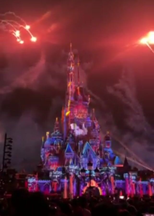 fireworks display over a Disney castle at night. The castle is illuminated with colorful lights and projections. Fireworks explode around the castle, creating a vibrant display. A crowd of people is visible in the foreground, silhouetted against the bright lights of the show. They appear to be watching the display and taking photos. The sky is filled with smoke from the fireworks, adding to the dramatic atmosphere.