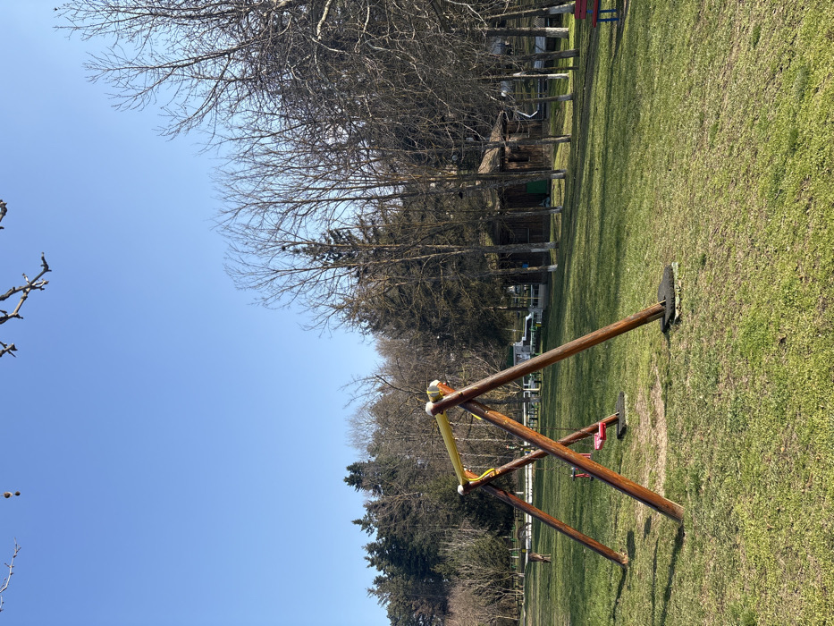 The scene depicts an unoccupied public park or recreational area in Knezha, Bulgaria, under a clear blue sky. In the foreground, a wooden swing set with thick A-frame supports and a yellow horizontal crossbar stands on a patch of green and brown grass. Two swings are suspended; one features a distinct red seat, and the other has a pinkish-red seat. Black rubber mats are visible directly beneath the swing set's ground-contact points. The midground consists of an expansive grassy field. To the left, several picnic tables with white and green benches are present. Further to the right, a small, rustic wooden cabin with a dark roof is partially obscured by trees. A red and blue park bench is located on the far right edge of the frame. The background is dominated by a dense forest composed of a mix of bare deciduous trees and evergreen trees. No individuals are visible, and no actions or interactions are occurring within the frame.