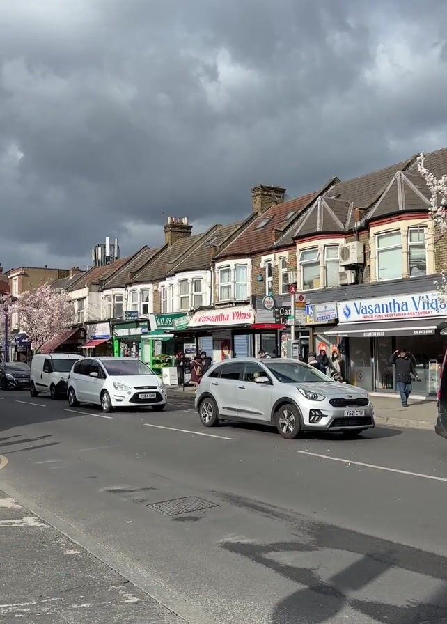 The camera pans from right to left, revealing a street lined with storefronts, parked cars, and a steady stream of traffic on a day marked by an overcast sky. On the right side of the street, there are several businesses, including a restaurant called "Vasantha Vilas" visible with its name clearly displayed. People can be seen walking along the sidewalk, and one individual is standing in front of the restaurant. The street itself has traffic moving in both directions. Various cars, including a silver Kia and a black van, are seen driving on the road. As the camera pans, it reveals more of the street and the storefronts lining it. A large sign that reads "EAST" is visible, hung over the street. People are walking on the sidewalk, some carrying shopping bags, as they navigate the bustling street scene. The background shows more buildings and the architecture typical of an urban area. The sky is filled with dark clouds, indicating that the weather is overcast. Additionally, there are flowering trees blooming along the street, adding a touch of color to the scene.