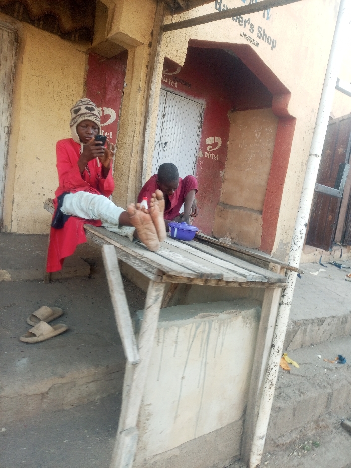 Two children are near a Barber's Shop. One child is sitting on a bench using a phone, while the other sits nearby with a small blue container. Both are dressed in red tops. The child on the bench has their bare feet resting on a wooden structure, and wears a patterned beanie. A pair of sandals is on the ground near the bench. Airtel logos are visible on the building behind them. The setting appears to be a modest, possibly rural, commercial area.