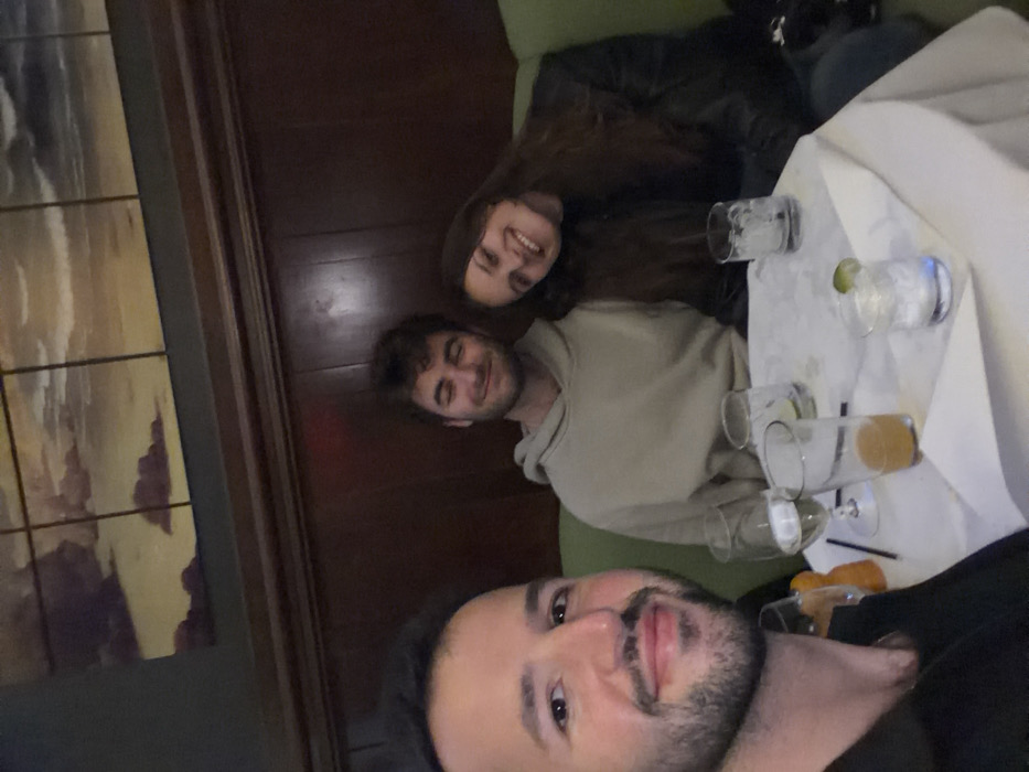 Three people are sitting at a table covered with a white tablecloth, empty glasses, and cocktail garnishes. The person in the foreground is taking a selfie, with dark hair, a beard, and wearing a black shirt. Behind him and to the left is a man with brown hair and wearing a light-colored hoodie. Behind him is a woman with long, dark hair, wearing a black jacket, and smiling. They are indoors with a wooden wall visible in the background to the left.