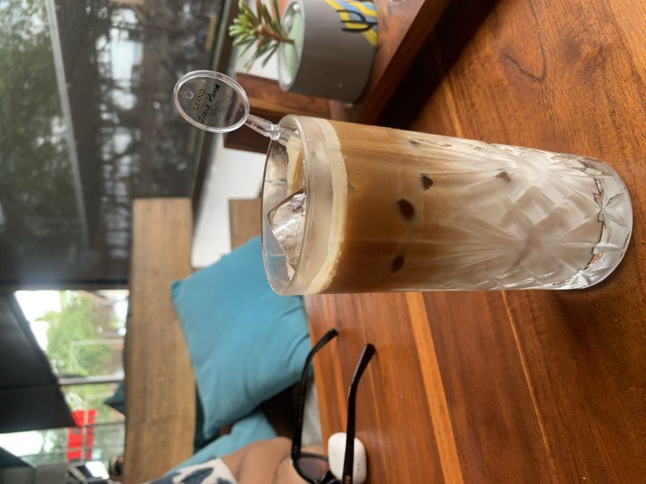 A tall glass of iced coffee sits on a wooden table next to a blue pillow and a pair of sunglasses. A small, clear plastic spoon rests in the glass. The coffee is layered, with a dark coffee base and a milky top. The glass has a patterned design at the bottom. In the background, a potted plant and the blurred image of the outdoors are visible.