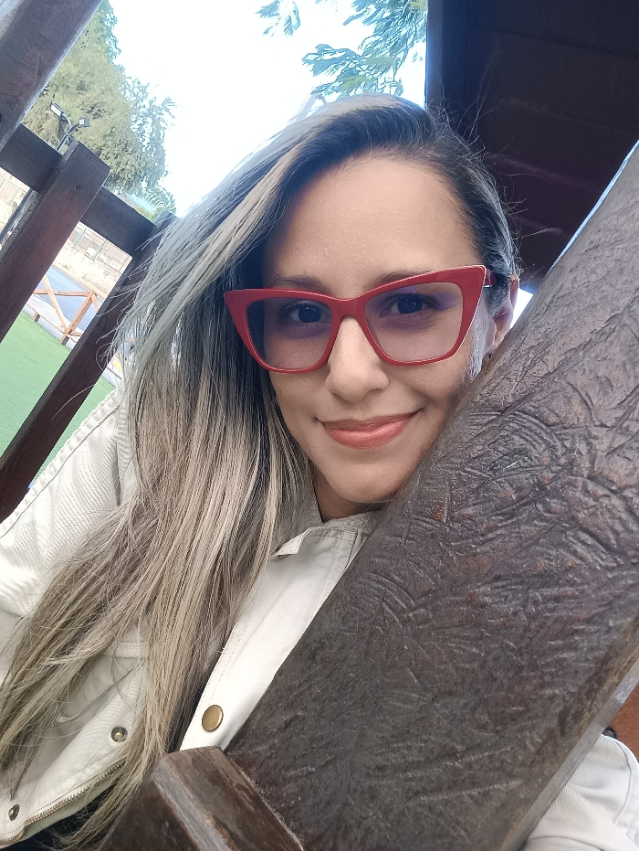 A woman with long, light-blonde hair and red cat-eye glasses smiles at the camera. She wears a white collared shirt and jacket, positioned outdoors, likely in a park. The background reveals greenery and playground elements. The woman leans against a large, dark brown wooden post with a textured surface. The sunlight suggests it is daytime.