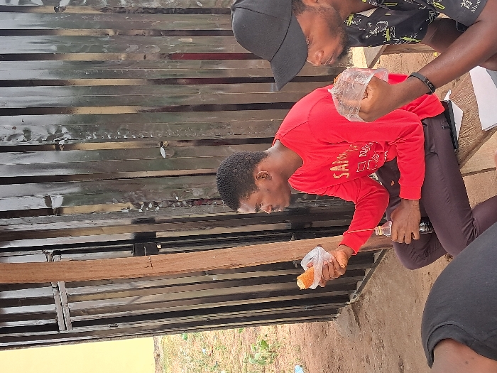The image displays an outdoor scene in Ihiagwa, Nigeria, featuring three individuals seated on a wooden bench. In the foreground, partially visible on the left, is the head and left shoulder of a person wearing a black shirt. The central figure, a young adult male with dark skin and short dark hair, wears a red long-sleeved shirt with white lettering (partially visible as "SAM..." and "NIGERIA") and dark trousers. He holds a light-brown, elongated food item wrapped in clear plastic in his left hand and a small, dark-colored bottle in his right hand. A black mobile phone is positioned under his right thigh on the bench. To his right, another young adult male with dark skin, wearing a black baseball cap and a black patterned short-sleeved shirt, holds a clear plastic-wrapped food item to his mouth, appearing to eat. A black wristband is visible on his left wrist. The background consists of a tall structure constructed from dark, vertically corrugated metal sheets. A vertical wooden beam stands in front of this structure on the left side. The ground beneath the bench and in the background is reddish-brown earth, with minimal green vegetation visible on the far left.