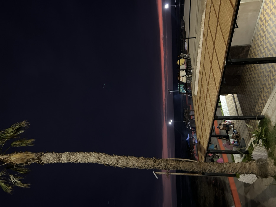 A sideways view of a seaside scene at night. A tall palm tree stands prominently against the dark blue sky tinged with pink along the horizon. Lights illuminate a beach area where people gather under a shaded structure with a zigzag patterned ground. Chairs and other items are visible on the beach. The overall atmosphere suggests a calm, peaceful evening setting.