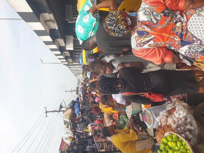 This image depicts a crowded outdoor market scene in Nkpor, Nigeria