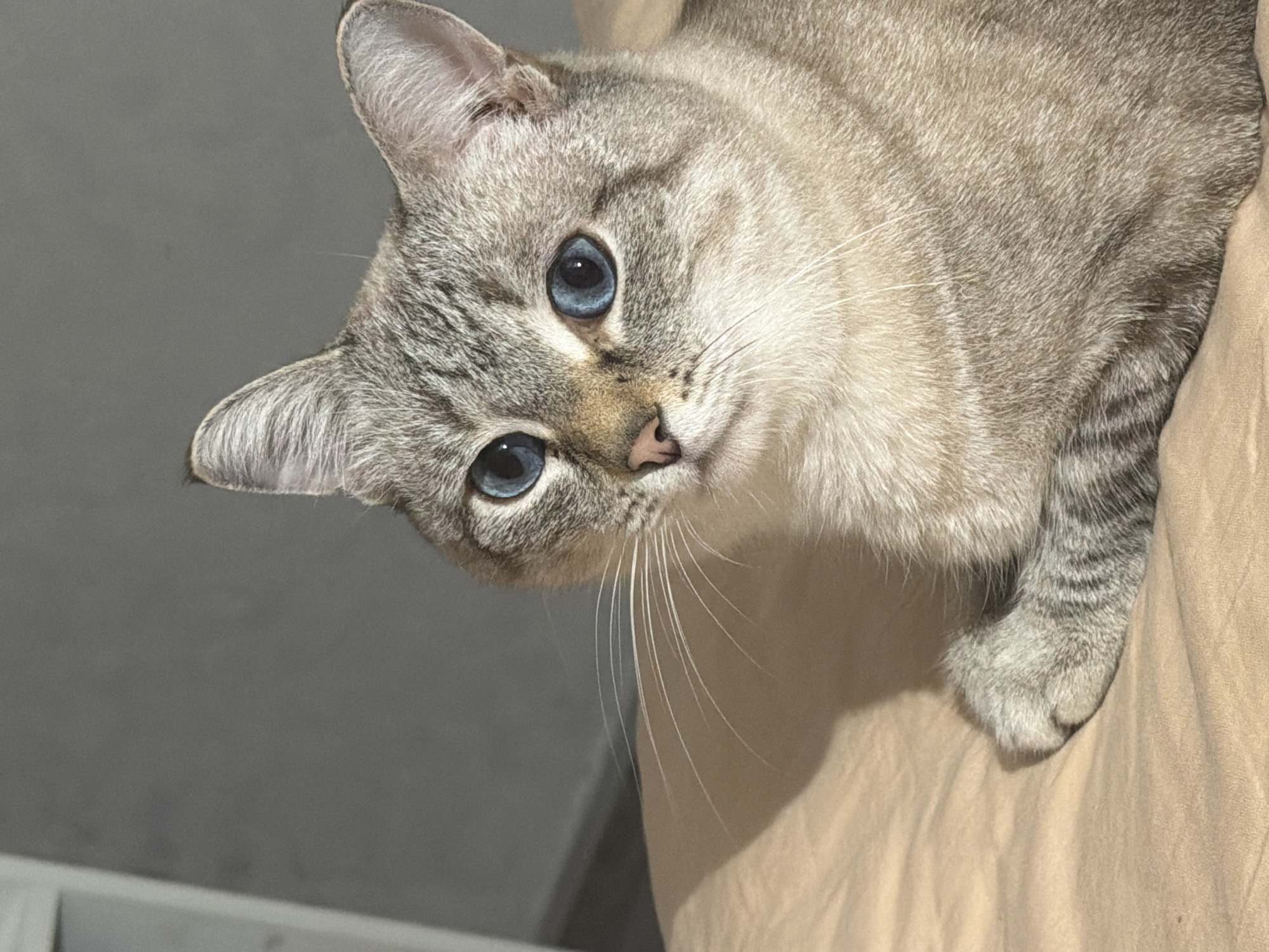 A close-up, tilted view features a light grey and beige tabby cat with striking blue eyes
