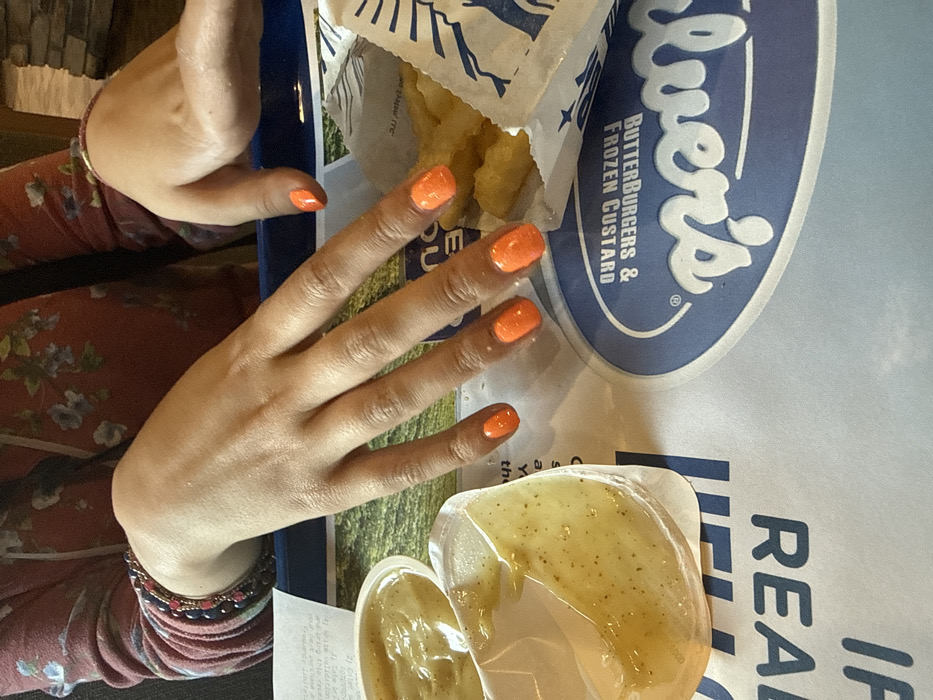 This image depicts a close-up, overhead view of a person's hands and a meal served on a blue plastic tray within a Culver's restaurant, specifically identified by the "Culver's ButterBurgers & Frozen Custard" logo on the tray liner. Based on this branding, the location is a Culver's restaurant in Lawrenceville, Georgia, United States. The subject's hands, exhibiting a light to medium skin tone, are positioned resting on the tray. All visible fingernails are painted a vibrant orange color. The left wrist is adorned with multiple beaded bracelets, appearing in shades of dark red and possibly dark blue. The individual is wearing a long-sleeved garment featuring a floral pattern of blue flowers on a reddish-brown background. Food items on the tray include two clear plastic containers filled with a yellowish-brown sauce containing visible dark specks, possibly a side dish like applesauce or a condiment. The container on the left is full, while the one closer to the center is partially consumed. To the right, a white paper bag contains several golden-brown, irregularly shaped fried food items, consistent with cheese curds or tater tots. A white paper receipt is partially visible beneath the left hand. The background is an out-of-focus, indoor restaurant environment.