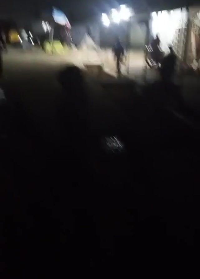 The video appears to be shot at night in an outdoor setting. The scene is dimly lit by streetlights. Several people are visible, walking around and standing in the area. There is a small structure with a blue and white umbrella. A motorcycle is parked near one of the buildings. The road surface appears to be asphalt. It is difficult to make out details due to the low light conditions.