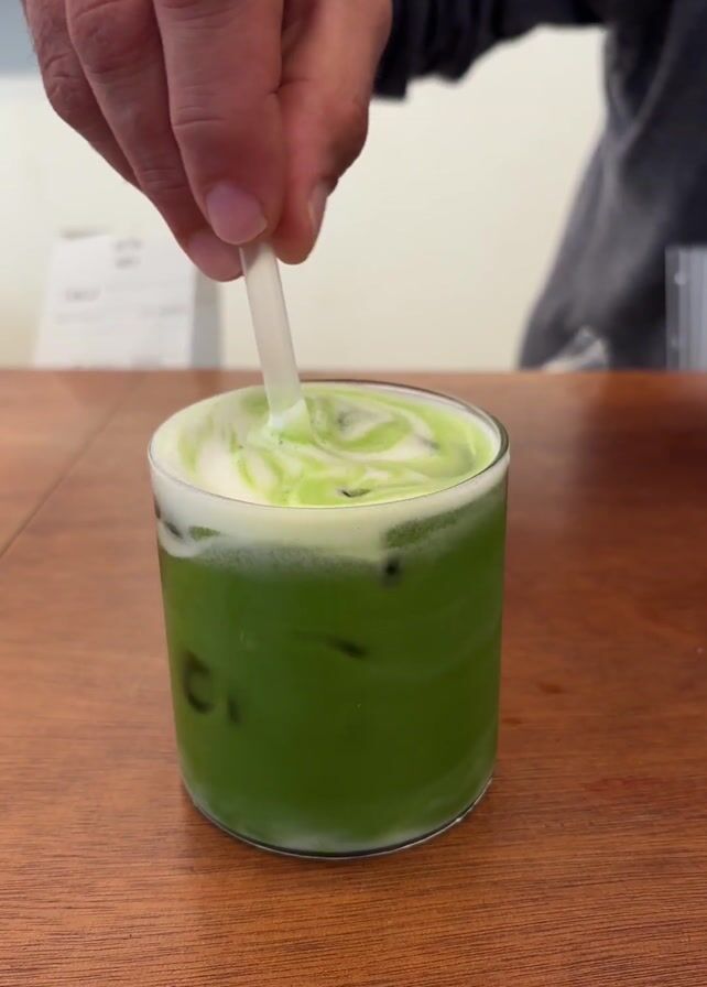 - "A person stirs a green-colored drink with a white, foamy topping in a clear glass with a straw" by FM-wUaYc2, licensed under CC BY 4.0