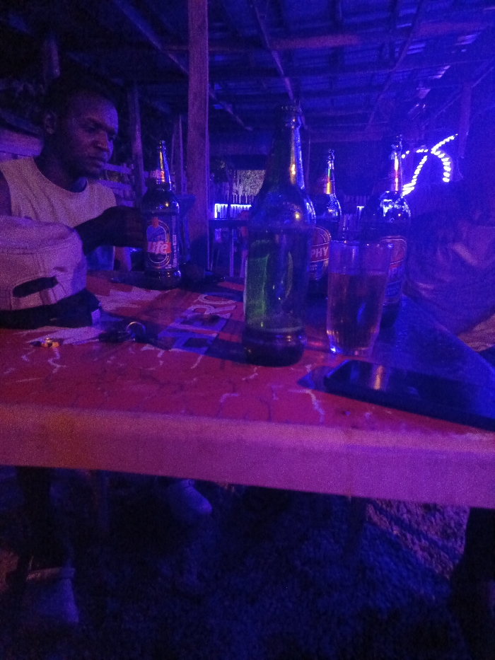 Under blue light, a man in a light-colored shirt sits at a red table at an outdoor bar. Several beer bottles are on the table, including brands labeled "LIFE" and "PHY." A glass of amber liquid sits beside one of the bottles. A baseball cap and cell phone also rest on the table, and the bar's structure is visible in the background.