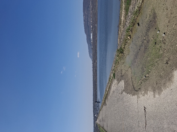 The image displays a daytime scene at the Shumen Reservoir (also known as Kumluk Reservoir), located near the city of Shumen, Bulgaria. In the foreground, a worn, cracked concrete or asphalt path runs diagonally from the lower left towards the distant horizon on the left. Adjacent to the path on its right is a strip of damp, muddy earth containing sparse green vegetation and scattered small stones, leading directly to the water's edge. The midground is occupied by the calm, blue surface of the reservoir, extending from the path towards the right side of the frame. In the distance over the water, slightly to the left, a grey concrete structure, consistent with a dam or water management facility, is partially visible. The far bank of the reservoir presents a distant cluster of light-colored buildings, indicative of a settlement or industrial area, situated at the base of a range of dark green mountains or hills that define the horizon. The sky overhead is clear and bright blue, featuring a few small, wispy white clouds. No individuals or discernible activities are present.