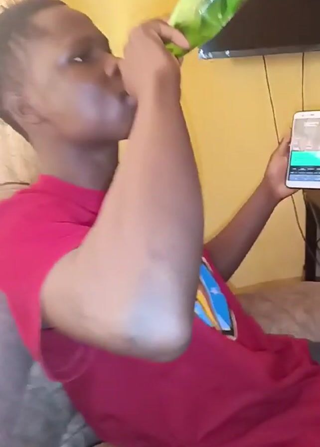 young man sitting on a couch, drinking from a green bottle, and holding a smartphone in his other hand. The man is wearing a burgundy t-shirt. The wall behind him is yellow, and a television is mounted on the wall. The couch appears to be gray. There's a console beneath the TV. The video also has a watermark saying "Shot on POWER P55c".