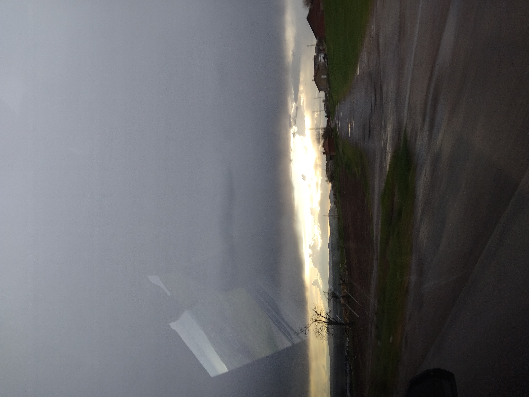 The scene depicts a rural landscape in Chokoba, Bulgaria, viewed from inside a moving vehicle. The sky is heavily overcast with dark grey clouds, but a horizontal band of bright, golden-white sunlight breaks through along the lower horizon, illuminating the distant terrain. In the foreground, the lower left quadrant shows a portion of the vehicle's interior, possibly the side mirror casing, blurred due to motion. The asphalt road surface occupies the bottom of the frame, exhibiting significant wear with visible potholes, some containing standing water that reflects the sky. Motion blur is evident on the road, indicating movement. The midground features a barren deciduous tree with dark, intricate branches on the left, set against the luminous horizon. To its right, the paved road, showing signs of disrepair and puddles, recedes into the distance, flanked by patches of green grass. Several single-story residential buildings are situated along the right side of the road; one house has a reddish-brown roof, and another, further back, is light-colored with a white vehicle parked nearby. Utility poles are faintly visible near the structures. In the background, rolling hills or low mountains are silhouetted against the bright horizon, extending across the frame. A prominent, somewhat rectangular reflection, likely from the vehicle's window, is visible in the upper left quadrant, showing a lighter, possibly inverted or distorted, view of the sky and distant landscape. No people or animals are present.