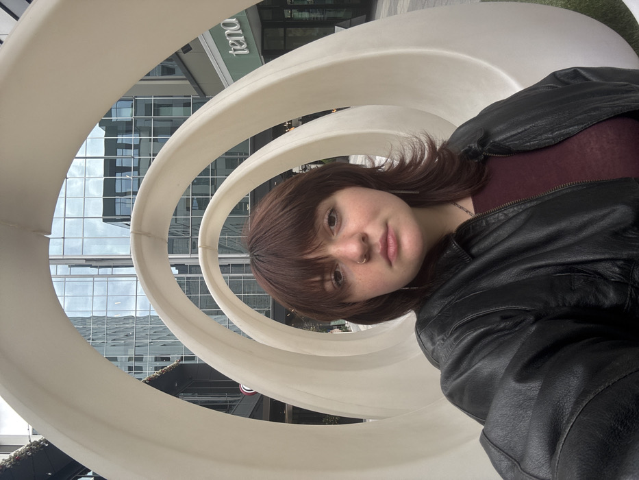 A woman with dark, shoulder-length hair and a nose ring poses close to the camera. She wears a dark jacket over a maroon shirt. Behind her is a large, modern art installation of concentric white rings. The architecture of a tall building with mirrored windows is visible through the rings, with a sign reading "tena" on top of the building. The perspective is slightly tilted, and the scene is outdoors in daylight.