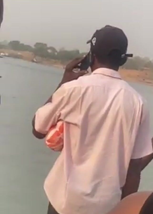 The video appears to have been taken near a river. The opening shot shows the back of a person with a silver head covering, a black top, and what seems to be a healing abrasion on their upper arm. Another person in a green shirt is partially visible. The view shifts to two men standing near the riverbank, one talking on a cell phone while holding a red and white object. The video then shows a wide shot of the river, focusing on the water's surface and the shoreline with trees and vegetation in the distance. The sky is overcast, and the water is a grayish-green color. Other boats are visible in the background in some shots.