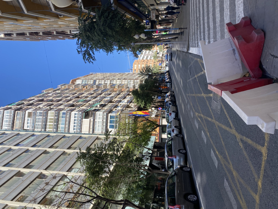 street in Alicante, Spain, located at the coordinates 38.347 latitude and -0.485 longitude. The street is lined with tall apartment buildings on both sides, with a small building in the distance. The street is empty of traffic, with only a few parked cars on the left side of the street. There are several trees on the street, and there are several flags hanging from a building on the left side. Two white and red plastic barriers are lying on the sidewalk, with one partially on top of the other. There are several people walking on the sidewalk to the right of the frame, some in groups and others individually. The sky is clear blue with some clouds.