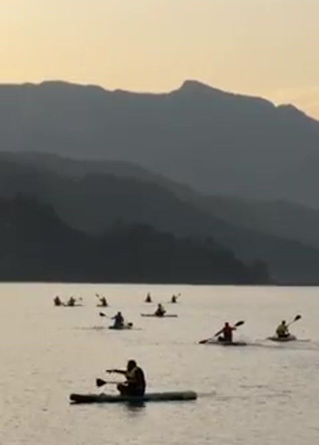 several people kayaking and paddleboarding on a calm lake surrounded by silhouetted mountains at sunset or sunrise. The light is soft and diffused, creating a serene atmosphere. Most of the participants are in individual kayaks, while at least one person is on a stand-up paddleboard. They are spread out across the lake, paddling in various directions. A bird flies overhead at one point.