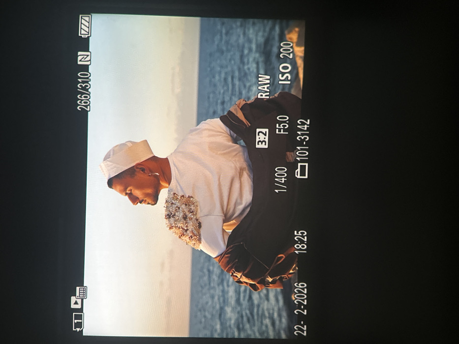 A sideways-oriented photograph features a person wearing a white shirt with decorative embellishments and a white hat. The person is positioned against a backdrop of the ocean. The camera settings are visible on the screen, including a date of February 22, 2026, at 18:25, ISO 200, aperture f/5.0, and shutter speed 1/400. The image is in RAW format, with aspect ratio 3:2, file 101-3142. The battery level is indicated as near full (266/310).