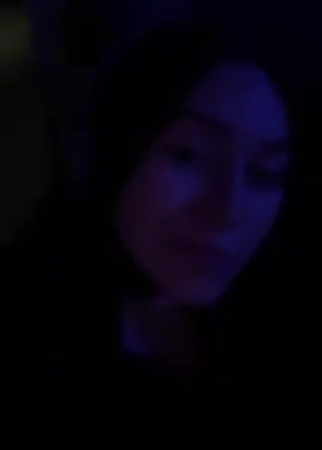 person with shoulder-length dark hair wearing headphones, sitting in a car, possibly at night. The lighting is predominantly blue, making it difficult to discern specific facial features or details. The person is looking directly at the camera. In the background, another person can be briefly seen. The car appears to be moving, evidenced by the changing background.