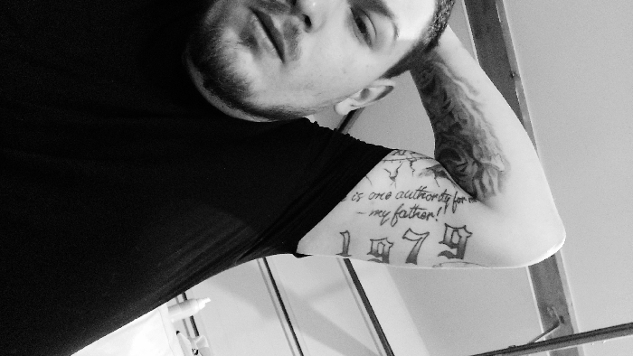 This black and white photograph depicts a male subject in an indoor setting within Senec, Slovakia. The subject is seen from the chest up, positioned at an angle with his left side closer to the camera. He has short hair and a beard/stubble on his visible left cheek and jawline. He wears a dark, possibly black, short-sleeved garment. His right arm is bent and raised, with the hand obscured, likely positioned behind his head or neck. The arm displays multiple tattoos: a script tattoo on the inner bicep reading "is one authority for- my father!", an elaborate, dark-shaded design further up the arm, and gothic-style lettering including "7" and other characters on the underside of the forearm/bicep. The background is light-toned, possibly a wall or ceiling. A dark, diagonal structural beam or frame is visible in the upper right, and a white, cylindrical bottle is present on a surface in the lower right background. The subject is looking directly towards the camera with a neutral expression.