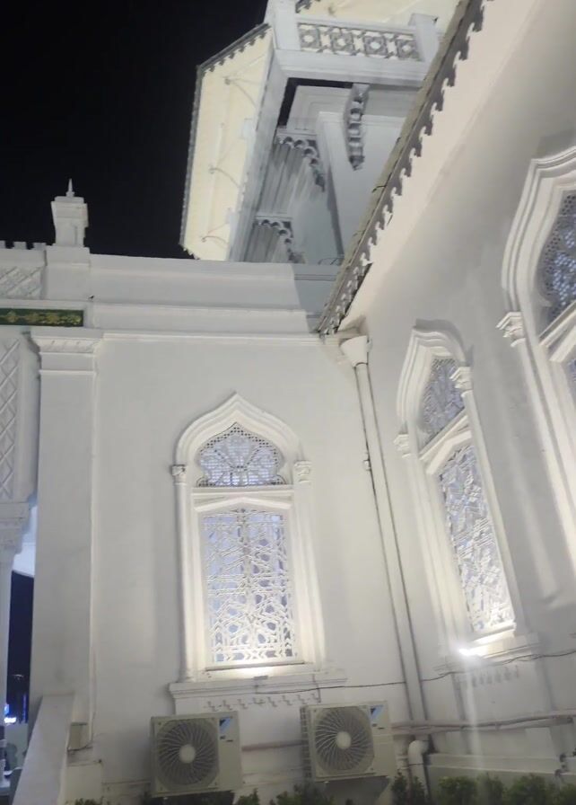 exterior of a white building at night. The building appears to be a mosque, with white walls, arched windows with intricate designs, and an arched entryway supported by white pillars. There are a few people sitting and standing on the steps leading up to the entryway. Air conditioning units are visible on the side of the building. The night sky is dark.