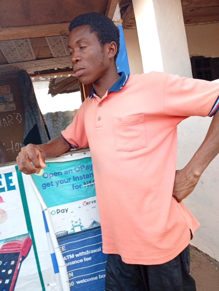A young man with short, dark hair stands outdoors in front of a weathered structure. He wears a salmon-colored polo shirt with a navy blue collar and dark shorts. He rests an arm on a sign that promotes "OPay," featuring the tagline "Open an OPay get your Instant..." and highlights ATM withdrawal fee benefits. The background includes a building with a window and wooden structures.