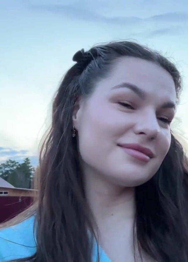 A young woman with dark hair and a blue garment is looking to the side and then smiles at the camera. She is outdoors with a wooden house on the left and another structure behind her on the right. The sky is partly cloudy. Someone asks, "Are you drunk?" and she says "No."