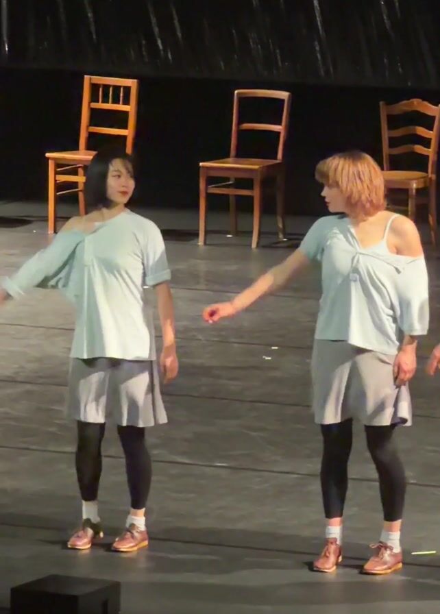 Two women are performing a synchronized dance on a stage. They are dressed identically in light blue tops, gray skirts, black leggings, and brown shoes. The tops have one shoulder slightly exposed. Three wooden chairs are arranged behind them on the stage. The background is dark. The dancers move in unison, extending their arms and shifting their weight.